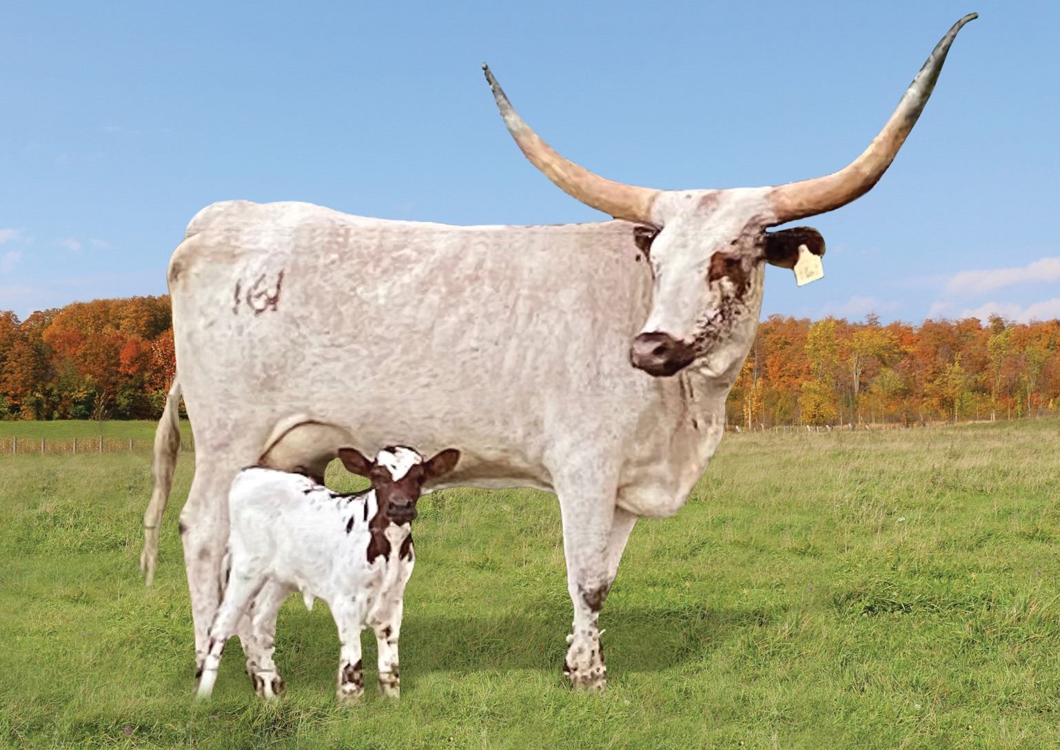 COMMENTS: LM Horne Aplenty, will be a twisty big-horned cow — and those tips are going straight back. She boasts special Longhorns in her pedigree such as 3S Danica, 3S Touchdown Tari, Delta Van Horne, Top Caliber, and others. Special bonus — she sells with a young calf at side, also sired by Century 100, adding a double dose of 3S Danica and 3S Touchdown Tari. This is a great package for someone!