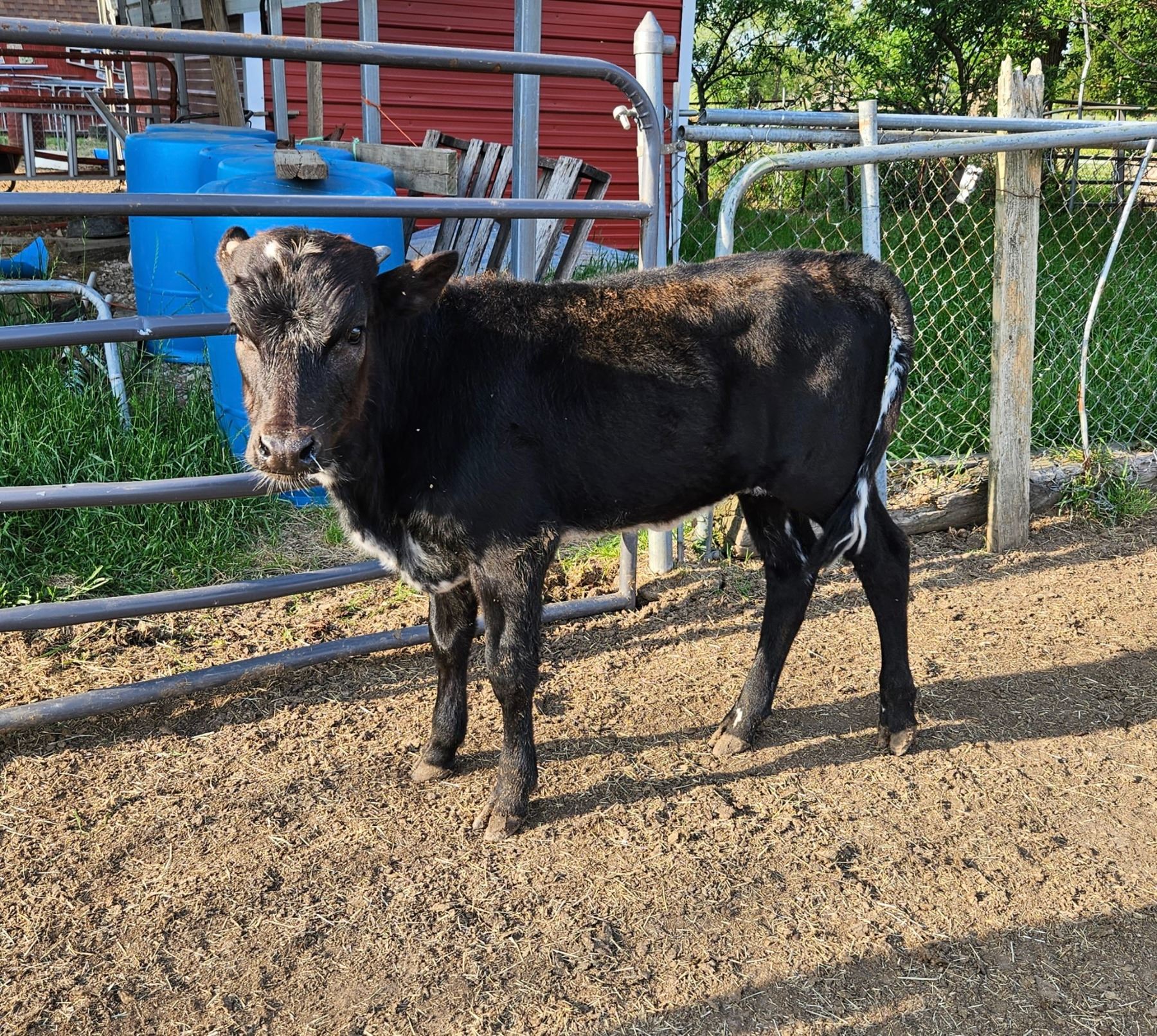 Morticia was born on Halloween. Her Dam LMR FEISTY RIO TARI, Walked off from her. We cleaned her up and carried her to the barn, She was raised on our Jersey, Elsie. Luckily I had a freezer full of colostrum, and gave her 2 weeks worth. Then she was raised on a bottle, until she was big enough to latch on. Then like a pro, she was raised by our Jersey. Morticia, is dog gentle. If you want one in the pasture that you can take friends and family out to feed cubes, Morticia is it.