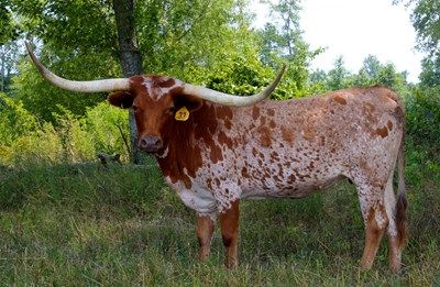 Liberty PC341 was one of Joe’s favorite 2010 models. She is out of a great cow named CK Liberty. This youngster has so much eye appeal that it makes everyone want her in their pasture. She is bred to Country Chex, Joe’s Hot Playboy Son that he recently sold to Royal Heritage farms. This is one of the prettiest Longhorn cows in the breed!