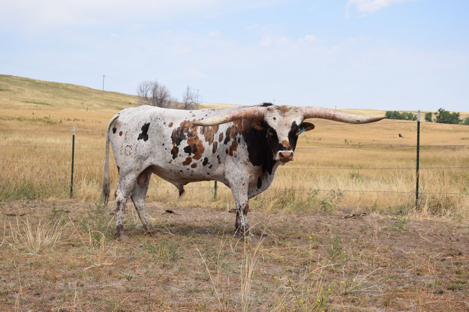 M2 Texas Playboy has served us and other local breeders well for 3 years. A 1700+ lb big horned bull, he produces solid traditional framed, well colored calves. Playboy is a good outcross and foundation builder. Sired by the late KC Just Respect out of over 92" Power Cow Vanilla Milkshake. We have several daughters we are keeping to carry on this genetic package. Playboy does have a tipped horn - approx 6-8" off the right horn .