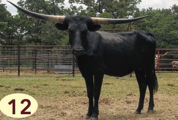 Comments: OCV. Marshall’s Chocolate Chip is one of the rarest sought after looks in the Longhorn business. Solid black with black  at horns! She is sired by the Horn Showcase winner JP Grand Marshall and her dam, Cookies and Cream, is sired by War Bonnet. She has it all and will bring the black gene to your herd. Current breeding and measurement announced sale day.