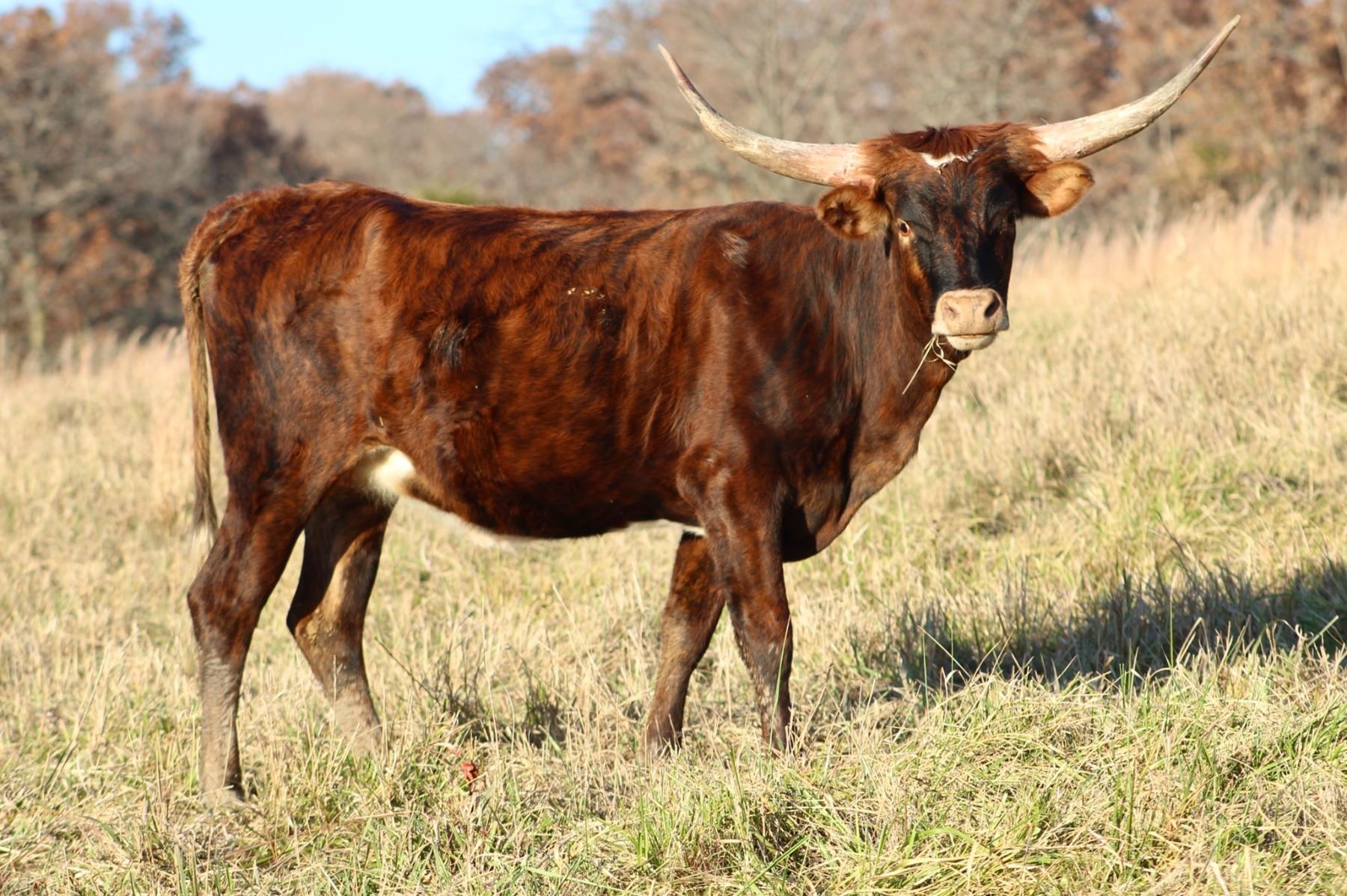 Comments: Double bred Cowboy Tuff Chex. Horn pedigree: 3 over 90” TTT and 3 over 100” TTT. Exposed to LTL Vin’s Maverick, a WS Vindicator son. Beautiful brindle.