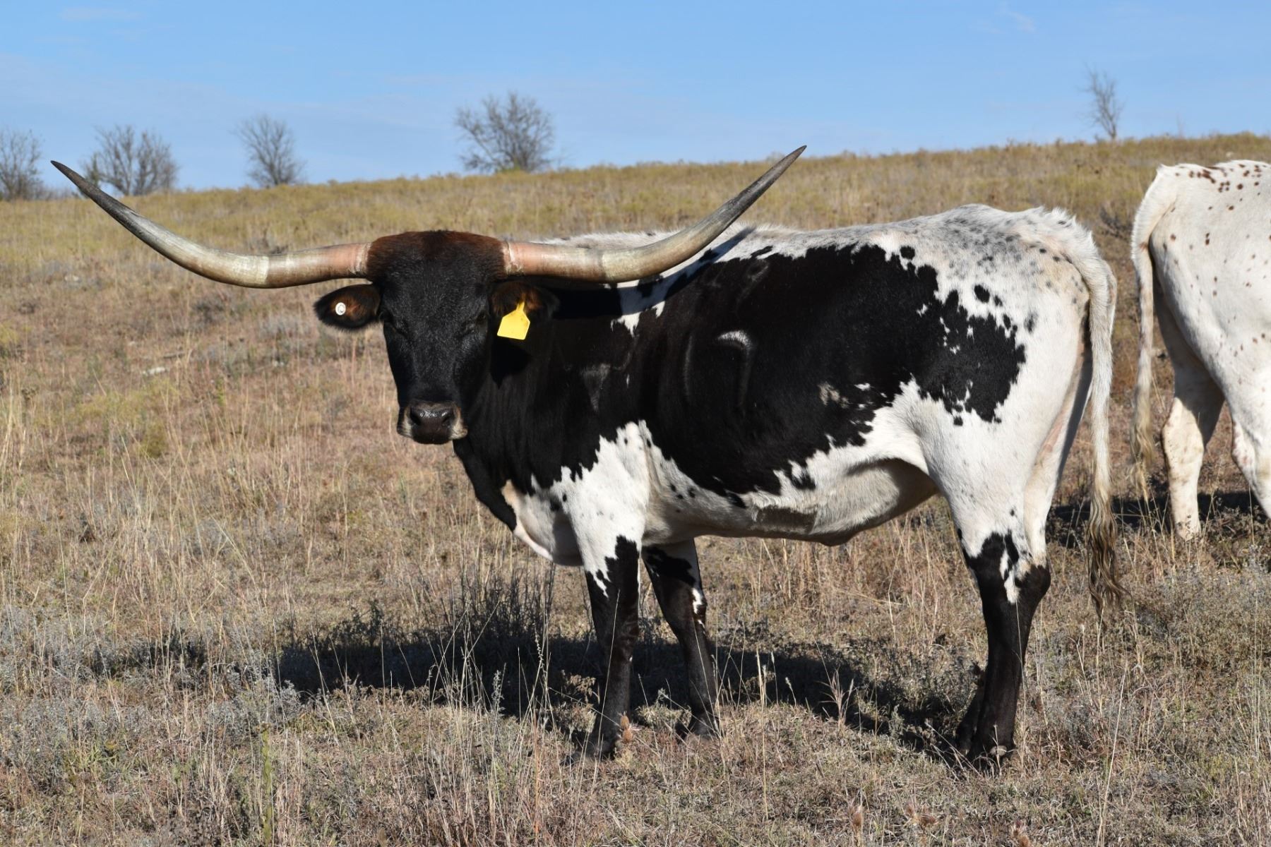What everyone is looking for black and white cow with a very nice horn set. Bred to Sleepy Horn for an early summer calf.