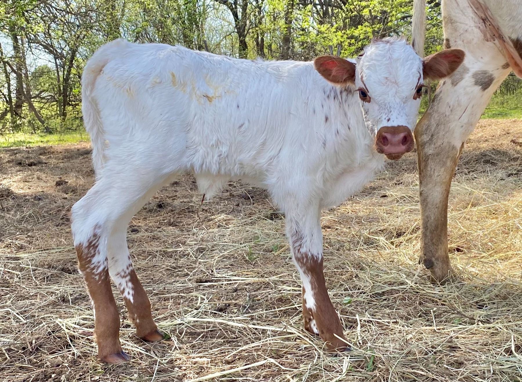 This heifer has the cutest eyebrows!! Her sire, 93.5" TTT BH Ferdinand is really good at putting the coolest horn sets on his daughters. MBR just sold a daughter of his for $7k at the HSC. Her dam is a daughter of Concealed Weapon, (look up CW granddaughters they are famously fabulous!), out of an Overkill daughter named Overdressed. My herd is littered with the Overdressed maternal line. It has been very productive, and consistent for me. The twist, and horn will come on this heifer.