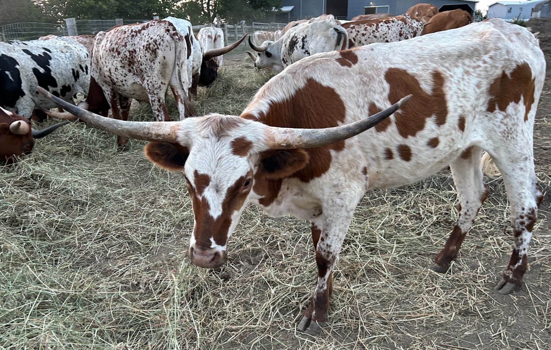 Her sire is a gorgeous Fifty-Fifty BCB son and his dam is the famous huge horned cow, D/O Miss Grande. Her family is full of loud colored, spotted up animals. Whimsey is calm, sweet, and easy to have around. She also has no