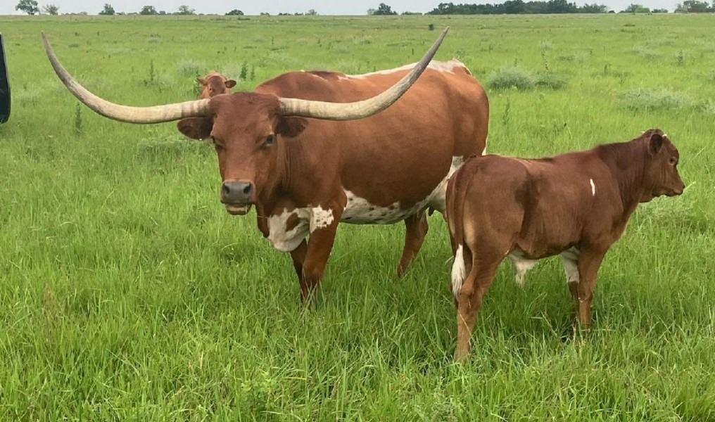 This feminine cow was bred by Bowman's. She's super gentle and milks like a dairy cow. Always raises one of the biggest calves every year. She has a bull calf at side sired by Sleepy Horn born on 04-14-23. Exposed to Money in the bank from 06-05 until sale date. Millennium futurity eligible.