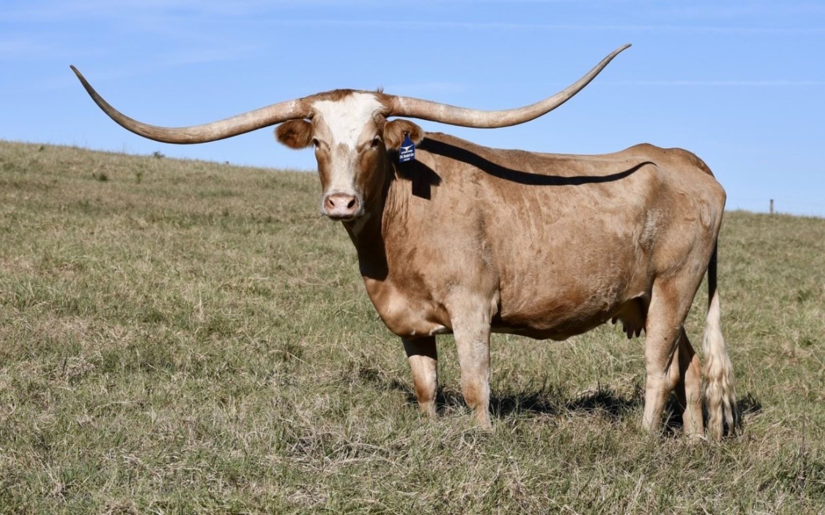 What a gorgeous blonde female with horns knocking on the 90” door. She combines eye catching color with impressive horn growth and a strong, balanced build.
