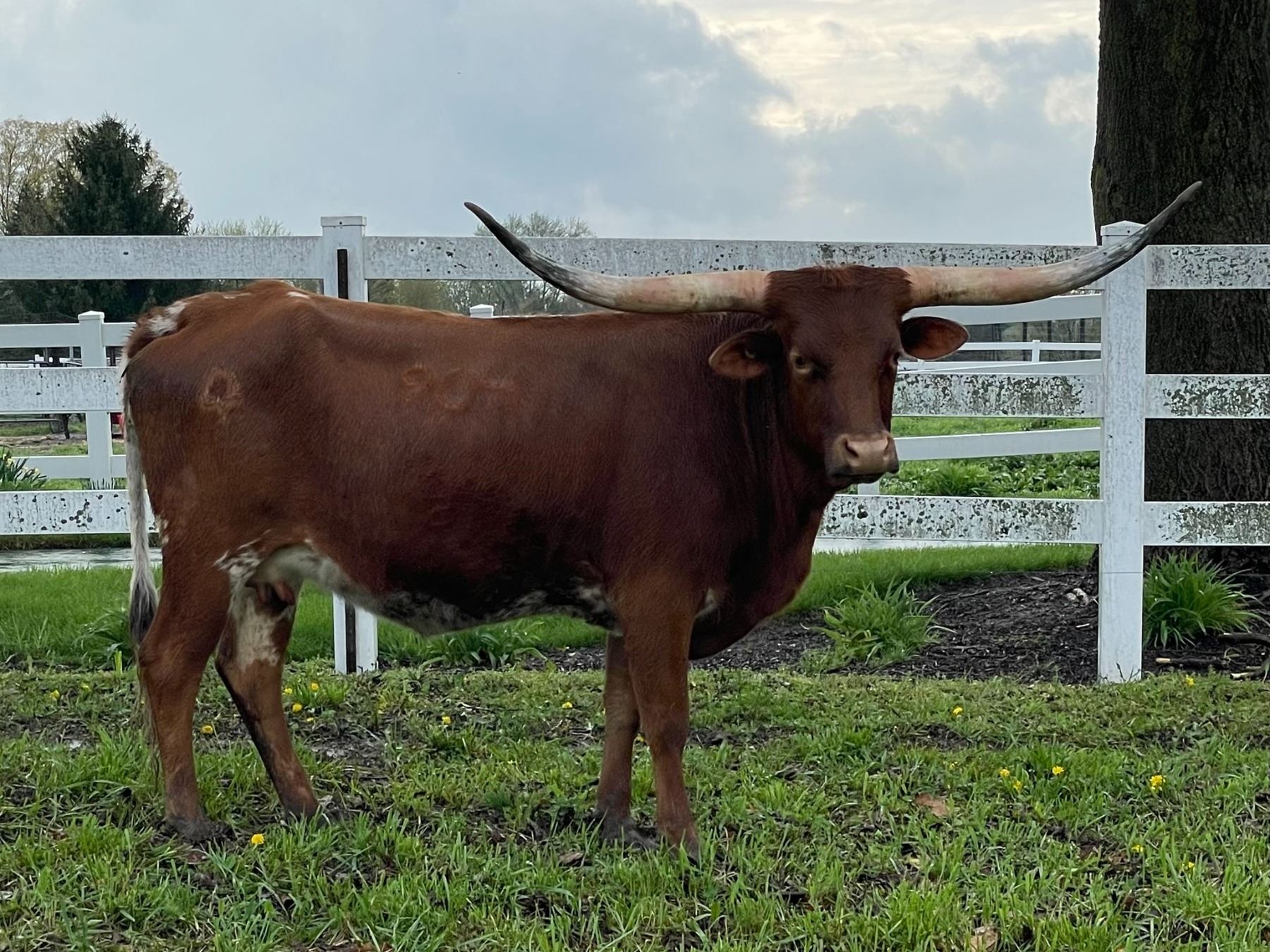 the longhorn breed. We are retaining her flashy 2021 heifer calf by Cowboy Tuff Chex as her