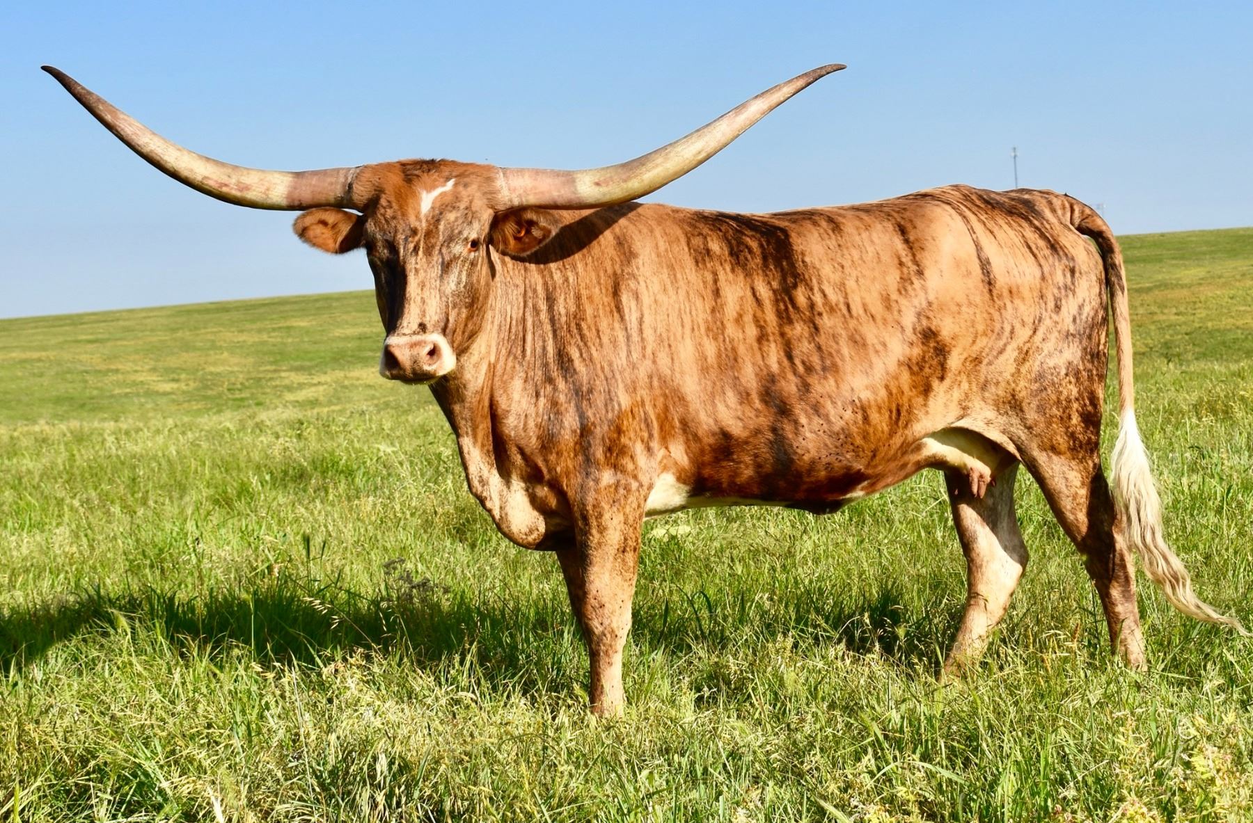 Comments: OCV. Johne’s negative. This stunning gold brindle cow comes from the Scott Pace program. She has a very strong maternal side--- her dam (PCC Double Trouble, 84’’), granddam (PCC Double Delight, 86’’), and great-grandam (Horseshoe J Delicious, 87.5” TTT) were over 80’’ TTT at an early age. That is what we call consistency in the Longhorn business. Consistency adds a ton of value to any breeder’s program because your future heifers will characteristically mimic the maternal line. The bulls in the pedigree also have legendary production – WS Jamakizm, JP Rio