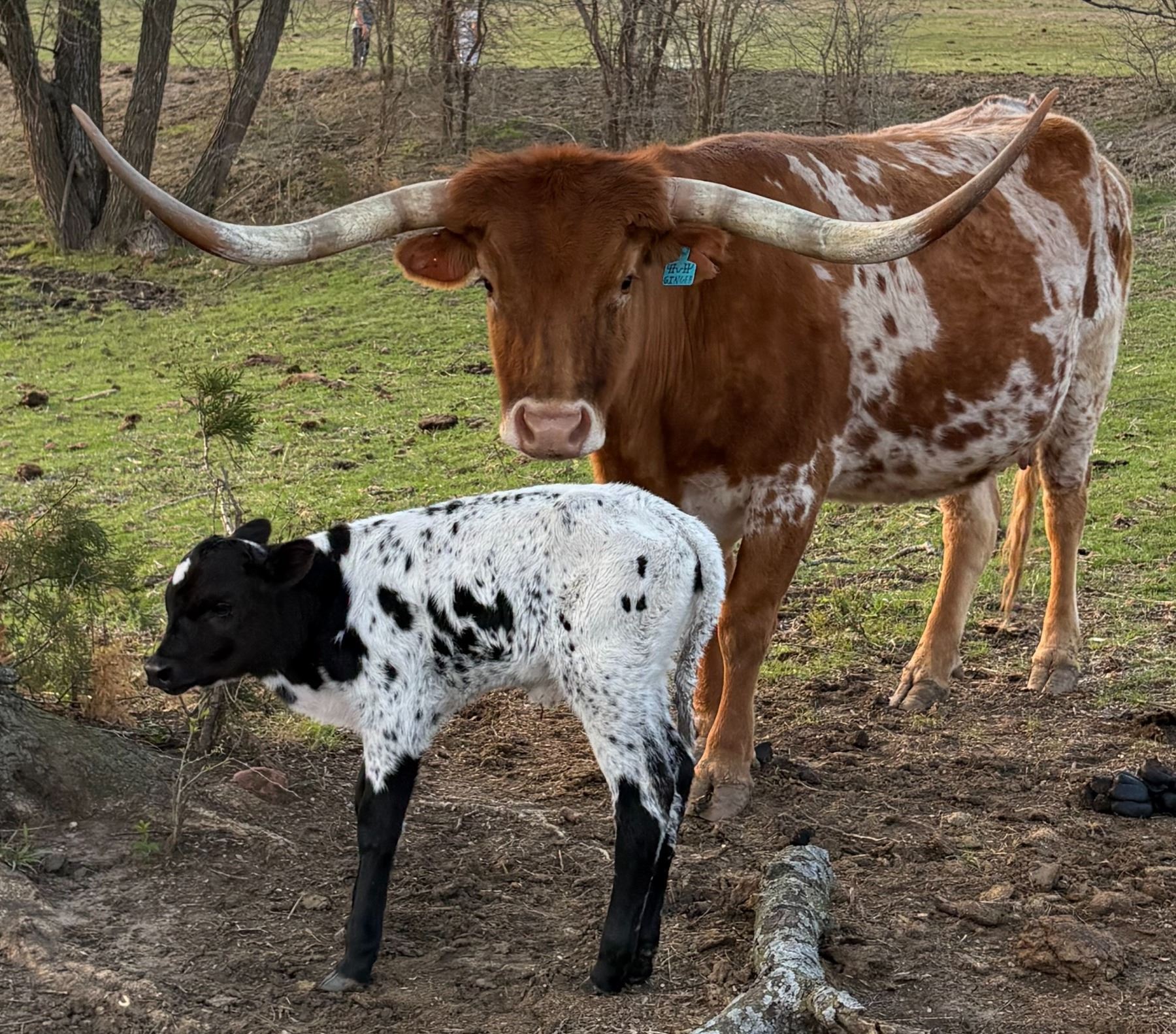 Heifer calf at side born 04/06/2026. Sired by Love Warrior, our big black and white bull!!