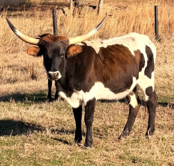 RHR Grand Irene is a young, registered Texas Longhorn heifer with an eye-catching Parker Brown Lineback color pattern and a pedigree stacked with proven Rio and Chex influence. Born 02/15/2023, she offers a balanced build, clean lines, and a calm disposition, making her a solid addition for breeders looking to add consistency, color, and genetic depth to their program. Backed by respected bloodlines including PCC Rim Rock, Bwana Chex, Brazos Rose Lula Bell, and BL Safari Up, this bull brings both visual appeal and genetic value to any herd.