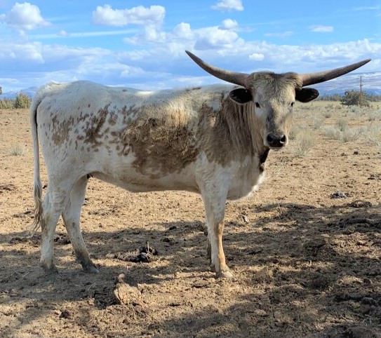 COMMENTS: Real pretty gentle grulla heifer with Victory Lap as her grandsire. Exposed to a large grulla bull, Blue Sued Shoes that could add JP Rio Grand and Iron Mike to the calf's pedigree. Then she was exposed to Road Man a son of Fifty-Fifty and grandson of Starbased Commander. Either way you can't lose. Updated breeding and horn measurements announced at sale.