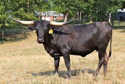 Here is a black JP Rio Grande daughter that has a lot going for her. She measured 55” at only 2 1/2 years old and with her lateral horns and strong horn producing pedigree, this heifer will become a great cow one day. She is bred to Country Chex for a very exciting calf.