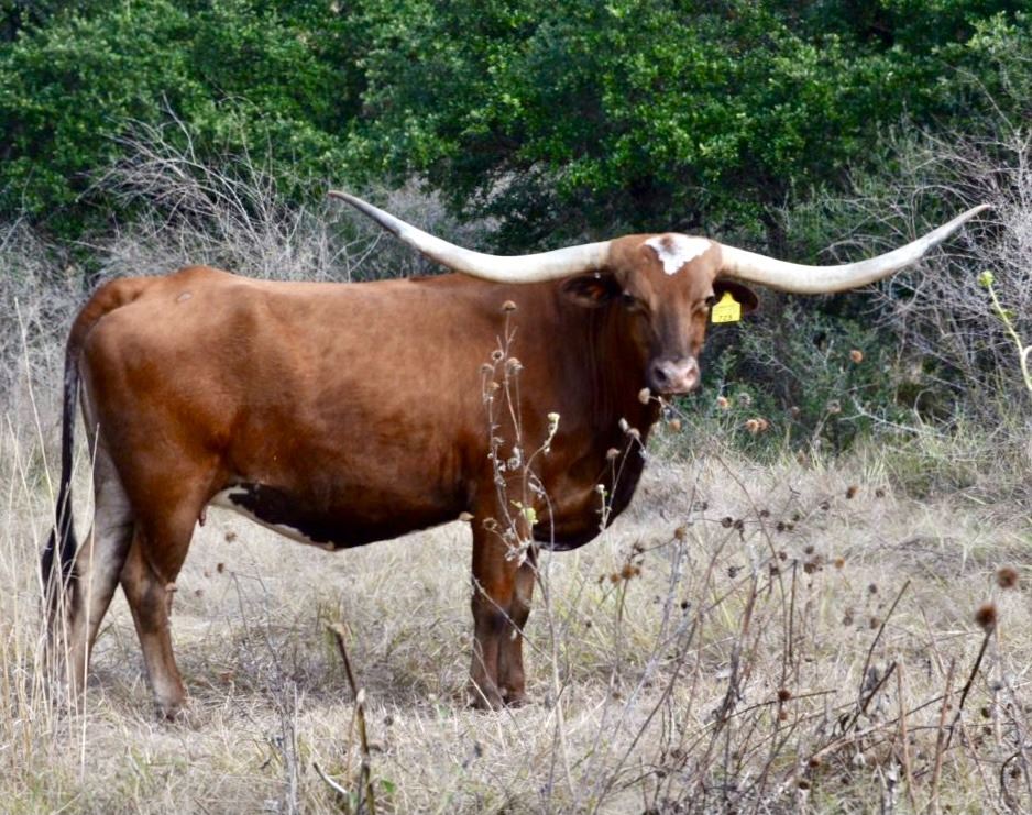 Comments: Monacos Feisty Top is an excellent young cow with lots of twist in her pedigree, from the Overhead genetics on the bottom side and Lady Monika on the top side. She is sweet, gentle, easy to work, and a great mama - all the attributes we value in a Longhorn. Her first calf, a gorgeous brindle bull, is owned by Richard Filip and we are retaining her second calf, a very nice heifer out of TKR Royal T, to preserve her genetics in our herd. "Mona" boasts a maternal half sister who measured 80" ttt at just 3 years 3 months. We're anticipating Mona will have a calf at side by sale time by KDK Wildfire, our large, tall, colorful, HSC bronze winning bull who measured 90" ttt before his fourth birthday! Exciting package! For updates and more information, visit www.kdklonghorns.com