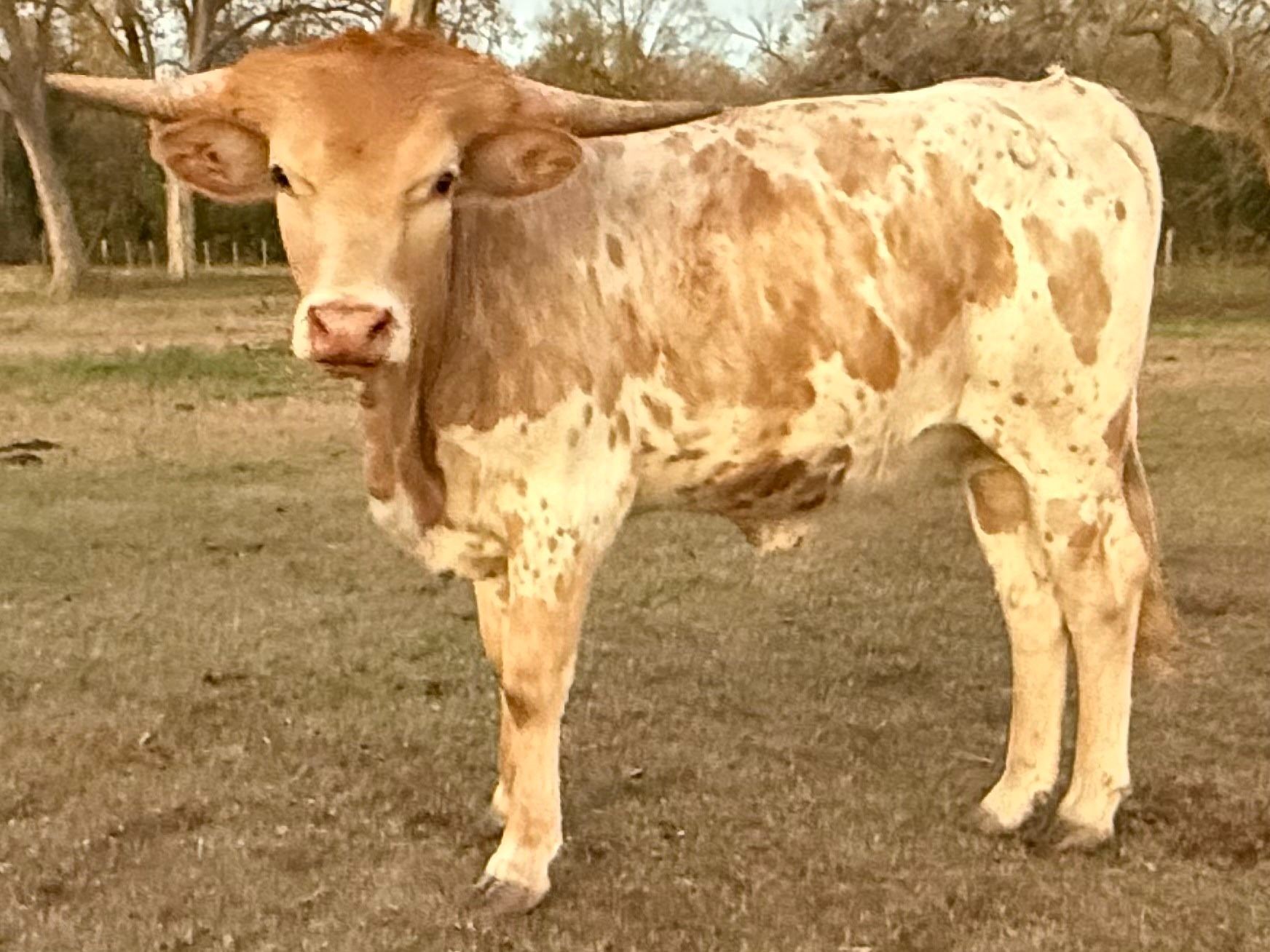 Here is your chance to own an amazing daughter of the longest horned bull in the breed - WT Kid Rock. Kid's Summer Night JH is an outstanding young heifer with a very correct conformation and sweet disposition. She loves groceries and will eat them right out of your hand while getting her head scratched. She is painted up just like Kid Rock with that unique, beautiful, dappled blonde coloration. She has impressive horns that are cranking back and twisting just like we all like to see. To top it all off, her dam is an M7 branded BR Cracker Jack daughter that also brings in CV Cowboy Casanova on the bottom side of her pedigree. "Summer" is the type of heifer that really hurts to sell. She was just exposed to our partnership bull Argo CA. This is a special heifer.