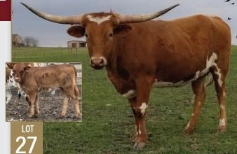and almost 90” horns. Even better, he has passed those traits on to this girl. She is gentle, curious, and one that everyone wishes they had in their pasture. The big bull calf at side is by Stop Box 2020, who some believe