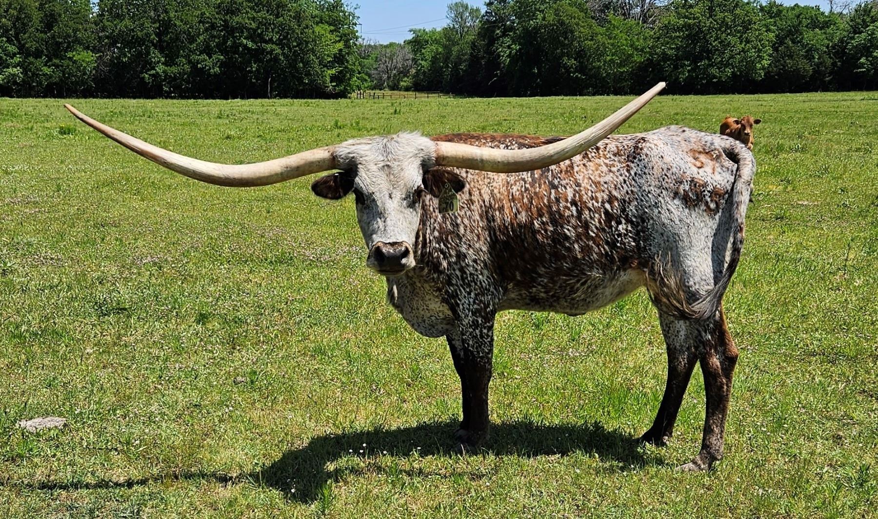 Diva is a crazy colored Happy 9 daughter out of an 85 inch TTT, Delta Lucky Diva cow. Happy 9 is a beautiful black and white bull , owned by the Fritz's. Diva's horns are really starting to take off. Diva has had a flashy heifer calf out of CV Call Of Duty DOB 07.02.21.Diva had another heifer with Top Saddle October 23, 2022. She will sell with Diva. Diva is being bred back with Top Saddle. Diva lost 5.5 inches off the right side. So, she would be, 80.50 + 5.50, making 86.00 inches TTT. On TH she measured 94.75 + 5.5, would make her 100.25!!