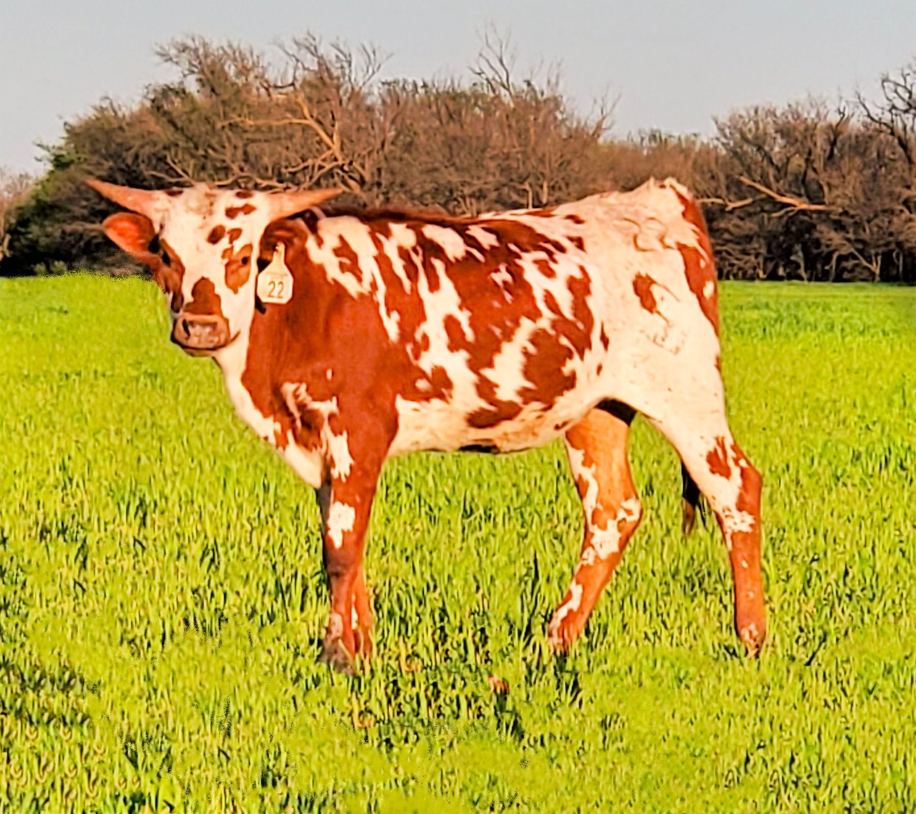 COMMENTS: OCV'd. SL Amber Grace is a beautiful red and white heifer with stacked pedigree by HL Red Baron. Amber grace has the great bloodlines, such as, JP Rio Grande, The Real McCoy, Trail Dust 40 and BL Patty Sue. This young heifer's horns are going straight back. She is a very easy keeper with a gentle personality. She will be a great addition to your herd.