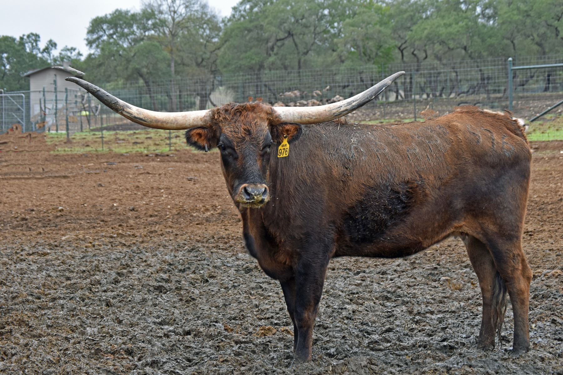 COMMENTS: SR Clout’s Rocky Road 976 is a beautiful, parker brown female with black horns. Getting her size from both her dam and sire, Rocky has grown into a well conformed cow who is calm and loves cubes. On 10/06/2022, Rocky was vaccinated; she weighed 770 pounds; and her horns measured 63 ¾” TTT. She is OCV’d, TB free, and Brucellosis free.