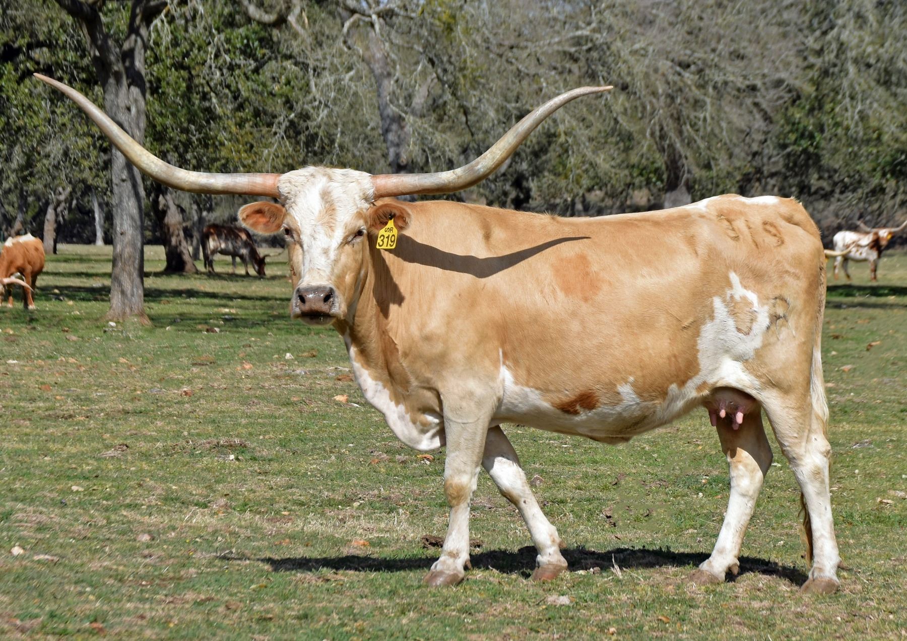 COMMENTS: SR Van Horne’s Yancy 319 is wonderful lemon yellow and white cow with smooth, beautiful horns. She has produced many fine offspring, with the last two being as yellow as she! On 10/06/2022, Yancy was vaccinated; she weighed 1175 pounds; and her horns measured 77 3/8” TTT. She is OCV’d, TB free, and Brucellosis free.