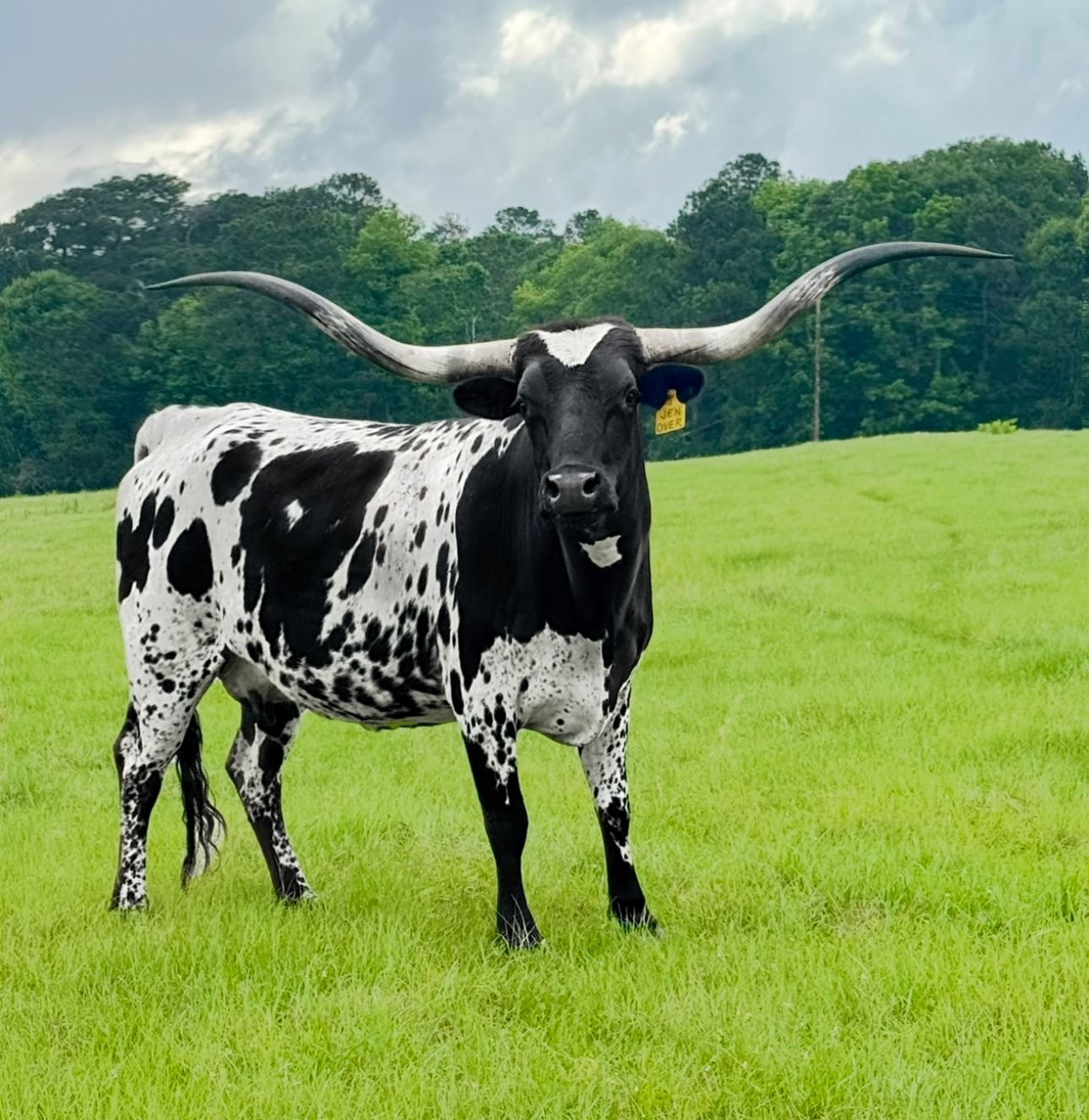Her sire was a son of the incredible Joyful Rider, her dam an own daughter of Overhead. She has the perfect body, udder, and more twist in her horn daily. She is the maternal sister to the young triple twist cow Rum High owned by Siller Longhorns. Combining Tempter, Dodes Blu Boy, $65,000 - Overjoyed, Overlyn x 2 and Zhivago x 2 = TWIST!
