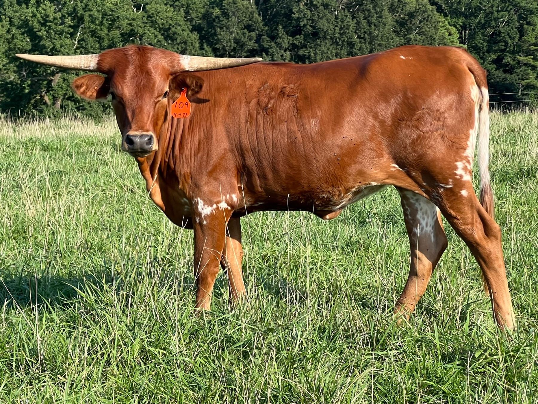 QT PI has an abscess between her toes and I'm not comfortable bringing a 3 legged cow to the sale. Good news for buyers is that "Roses Are Red" is fed up, fit, and ready to strut her stuff! She's almost a year and a half (DOB 4/4/21). She's flat horned, full figured, halter broke, and gentle as can be. We hate to let her go, but a sub lot has to be great to be noticed!