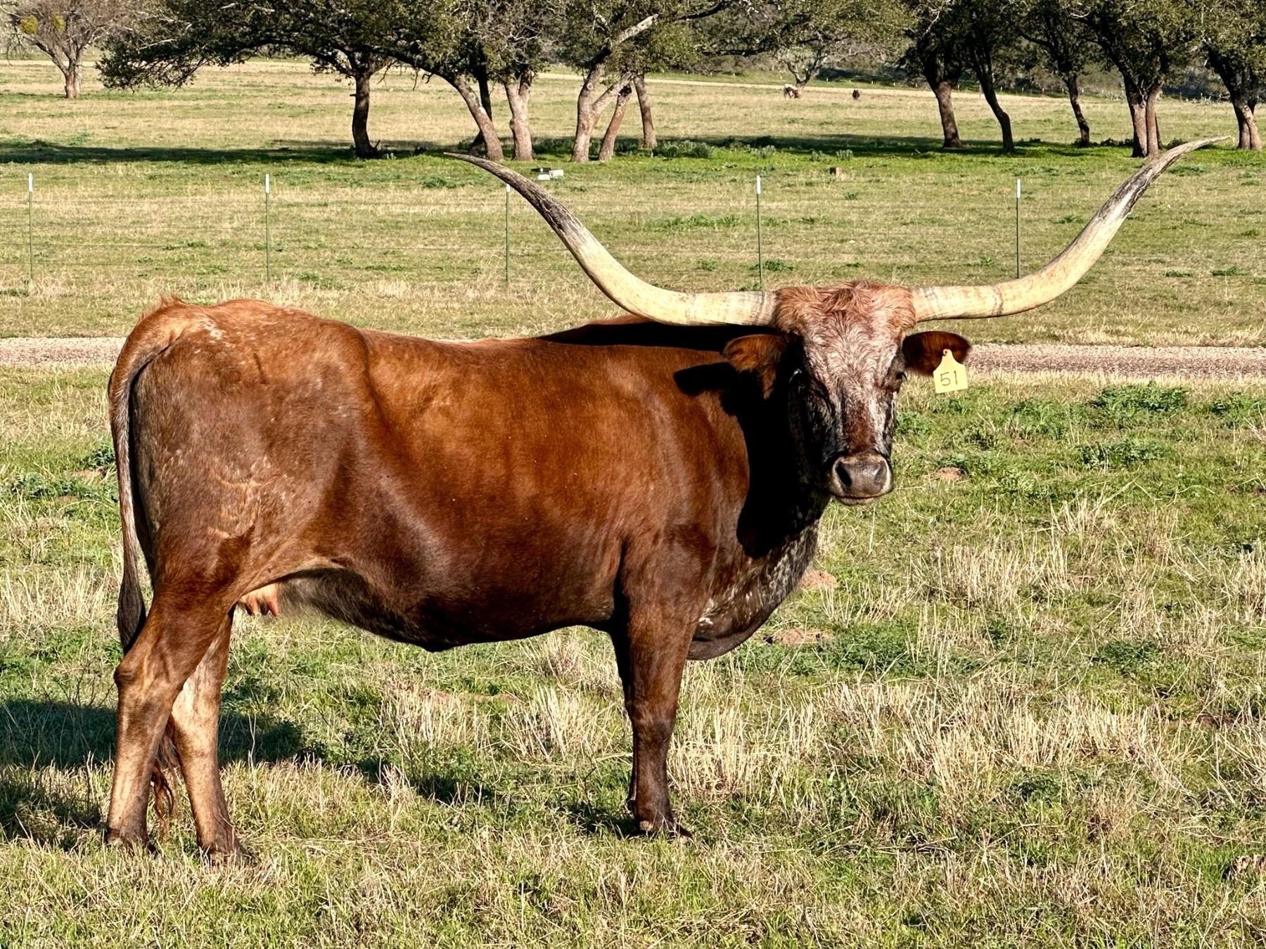 Comments: A mirror image of her famous dam, Sittin Cha Ching is a genetic full sister to the longest TH longhorn in the industry, M Arrow Cha Ching. One of the few remaining daughters out of 2020 TLBAA SENIOR PRODUCE OF DAM winner CC Cha-Ching ... she's got the same potential to produce 90-100 inch cows like her famous dam. CC-Cha Ching was just added to the list of 2024 LEGENDS for the sale this Fall ... here's your chance to own the daughter of a Legend. Remember, CC Cha-Ching herself was maybe 77" TTT when she passed - but she outproduced herself which is what breeders covet.