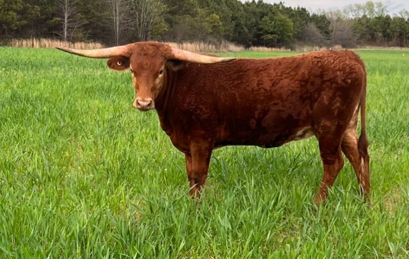 What’s not to love about this full figured 2 year old? She’s got it all, pedigree, conformation, and horn! She’s been halter broke by our youth and is an absolute joy to be around. She may be a blank red slate, but color is all over her pedigree. She will easily be your favorite producer. Icing on the cake: she is confirmed bred to LVR Sun Seared (Cut’n Dried X WS Sunrise)