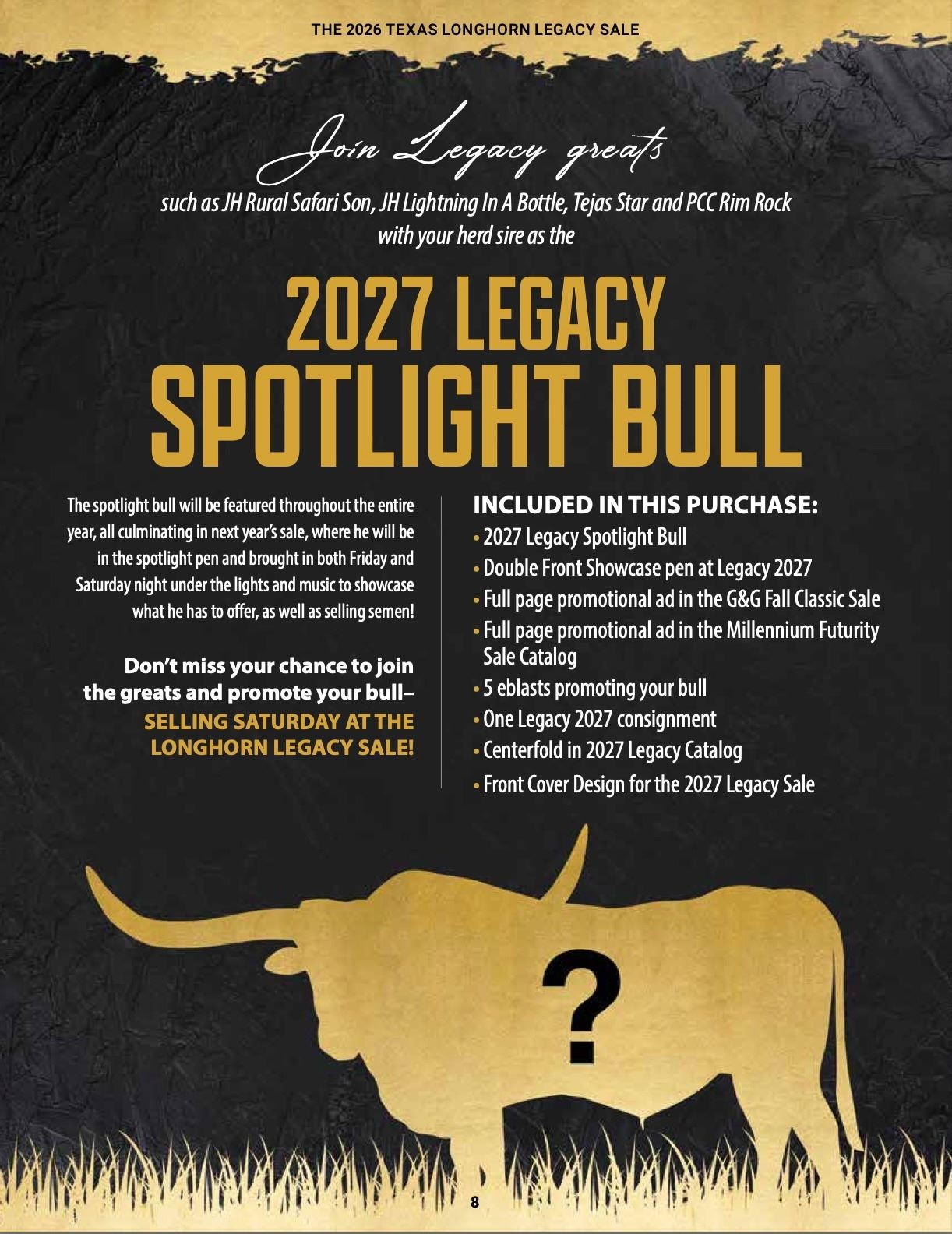 Here is your chance to have your herd sire as the face of the 2027 Legacy Sale! Join great bulls like Cool Hand Luke Chex, Marlboro Man LM, Colluder and JH Rural Safari Son. Along with a year of excitement surrounding your herd sire, with your purchase of the 2027 Legacy Spotlight Bull comes with: