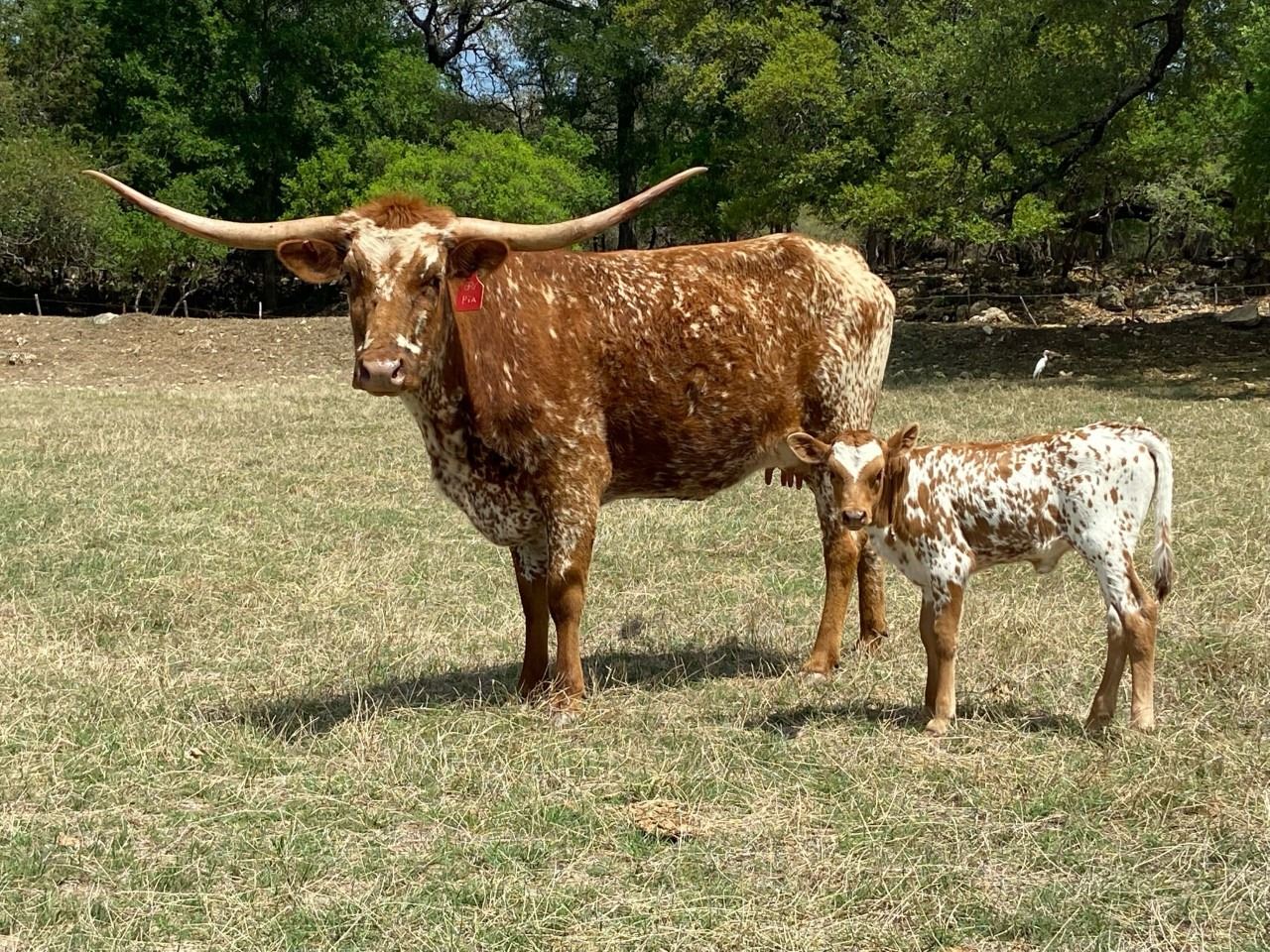 COMMENTS: Bella Pia, Beautiful pair with generations of Proven Genetics. Perfect Conformation with lateral horn growth and splashy color. Pia is a result of Bella Rio Ranch breeding combining El Coyote, Mountain Creek and Loomis! Pia has a beautiful heifer calf at side sired by Giuseppe our Houdini son.