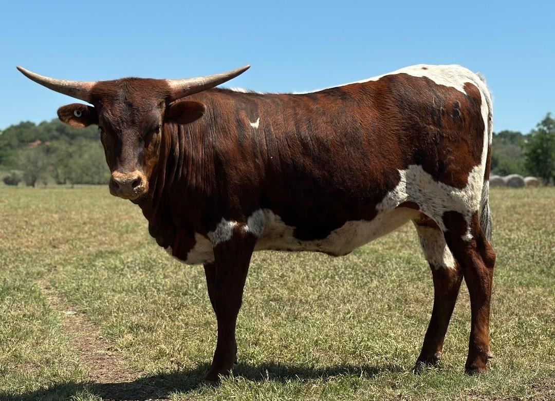 E+e, T-6, M-8. Dynamic Shadow is a young futurity winning prospect backed by proven horn genetics. Sired by Dynamic 0 (Jaguar Chex Horseshoe J Robust) and out of Gunslinger's Shadow (by AF Gun Slinger) she carries elite bloodlines known for horn, structure and color. Already showing steady horn growth, measuring 42" TTT at just 15 months, and carries the balance, color and style to be a standout front pasture female and future producer.