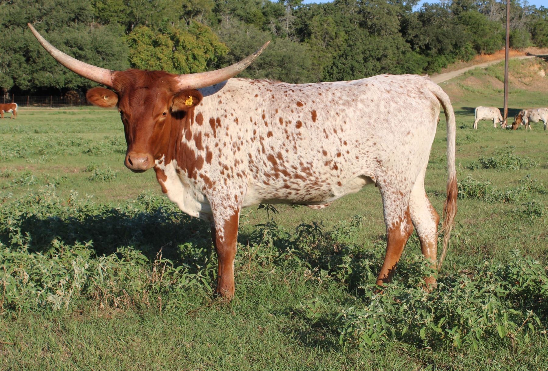 Nice red and white spotted heifer with lots of horn potential to roll out. She should make a really nice cow! Bred to High Country LP, estimated calving date of 03/11/2023. 11/12/2022 palpated 5-6 months.