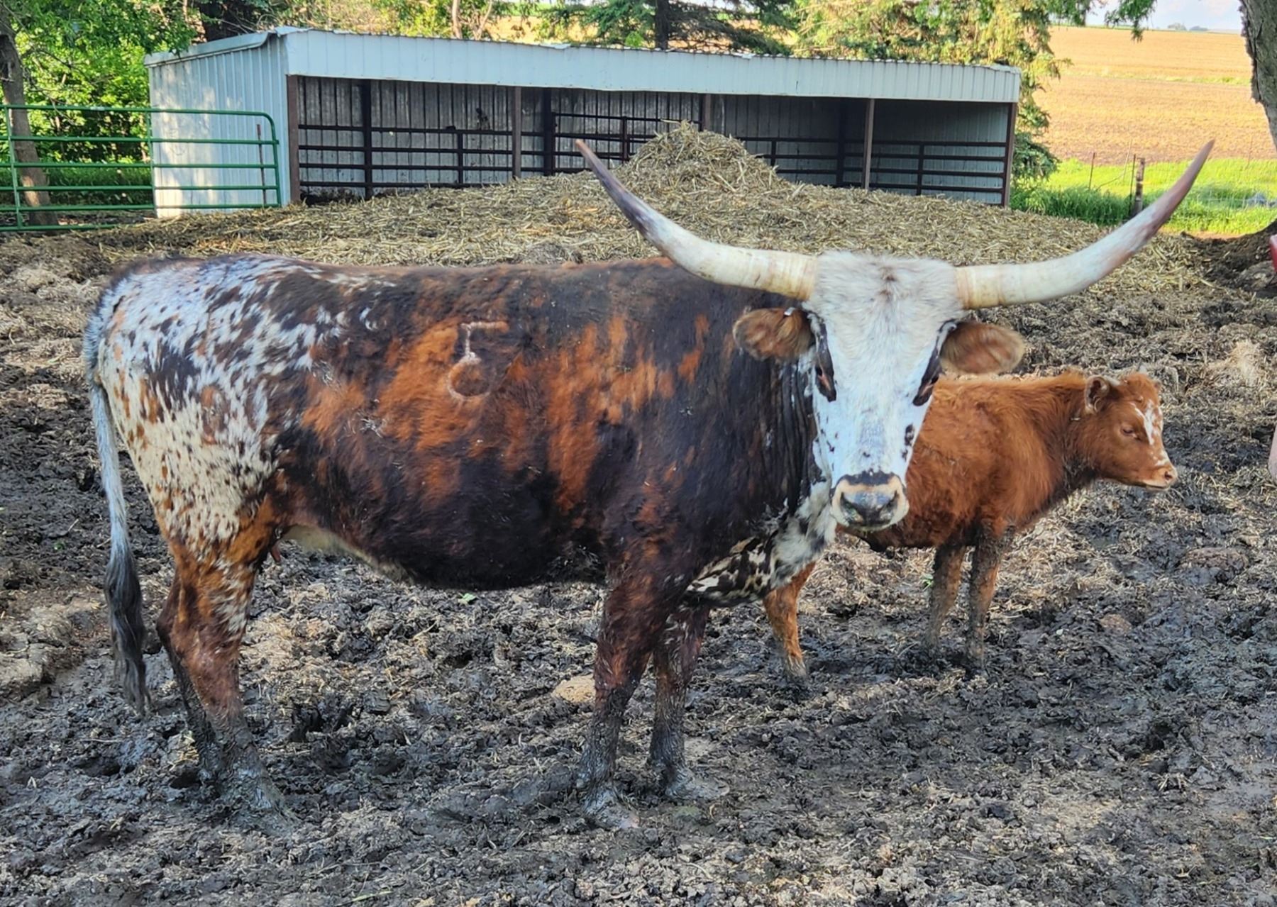 good and protective mother. She is exposed to our young bull, 4K Nacho, who has a ton of horn and color, with a well backed pedigree.