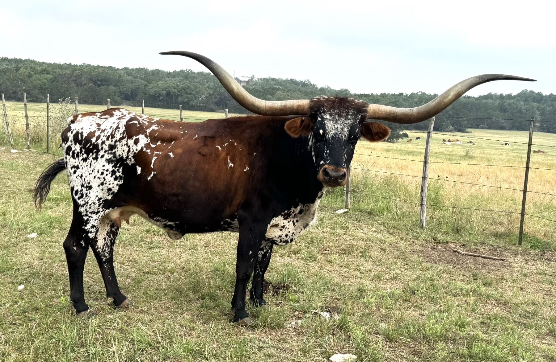 COMMENTS: Take a look at TC Kool! TC came out of the 2018 Butler Sale. From Thate Cattle Co, she was “well bred, lotta horn, lotta color.” TC is out of Dalgood-BLC Kulik x TC BomberSweet Girl B. Her sire is loaded with Buckaroo Chex, Farlap Chex over Rockette’s Mijha, Ace’s Sam and Delta Rockette. TC currently has a bull calf at side born 11/17/2023 by High Frequency FC (Radio R3 x Sia C3 from Jason & Rebecca Christa). TC is exposed to High Frequency. She is easy to work, raises a good calf and has “lotta horn”! TC measures 79” TTT on May 23, 2024. It twists and rolls. Lotta horn! Look at the 2018 Butler Sale, page 10, Lot 7 and see her growth!