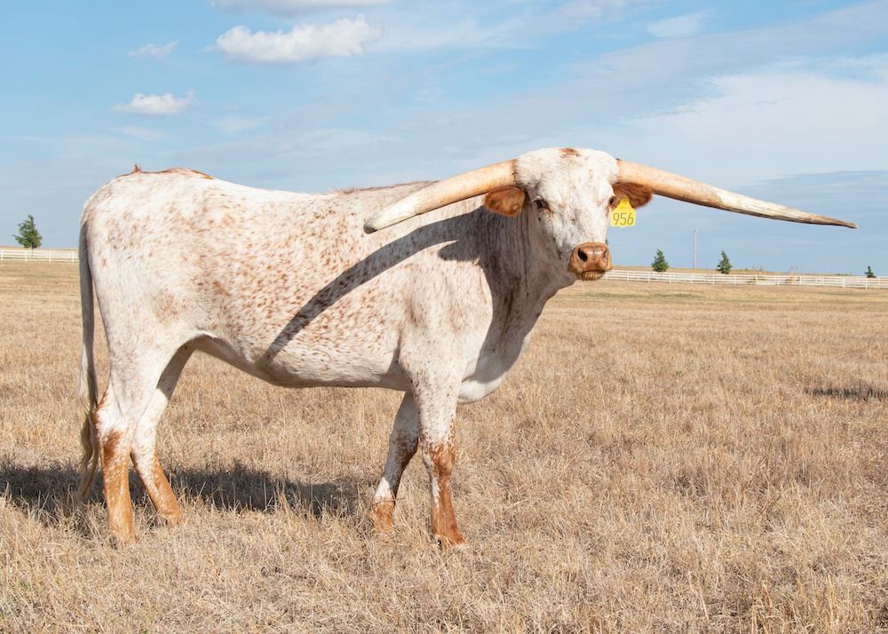 Check out the super cool swoop horns on the red roan daughter of TCC Gunsmoke and RJF Imagine - who is a product of two breed leaders: Cowboy Tuff Chex and M Arrow Cha Ching. 90" sire, breed leading genetics, wow factor written all over her. Take home a package feature the top of the breed right here.