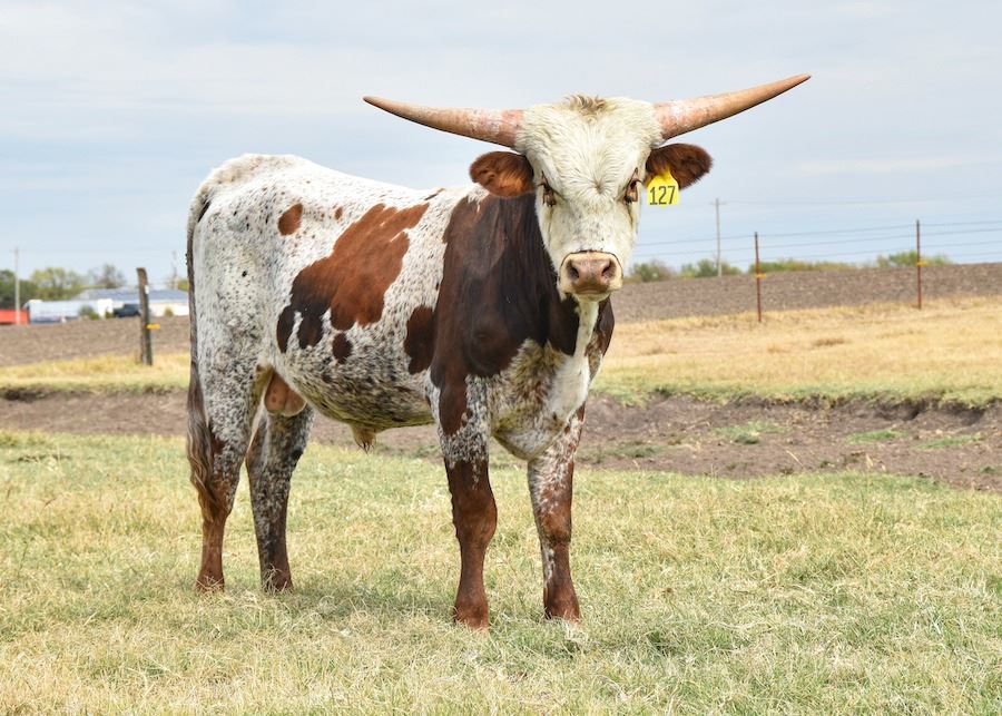 Texana Garland's Gal - she'll already an All-Time great, and here's your chance to own her son. He's sired by our tremendous bull, TCC Gunsmoke, and he's one cool dude! Brindle color, tons of eye appeal, correct lines, excellent horn and disposition. Did we mention that amazing pedigree? Special opportunity right here.