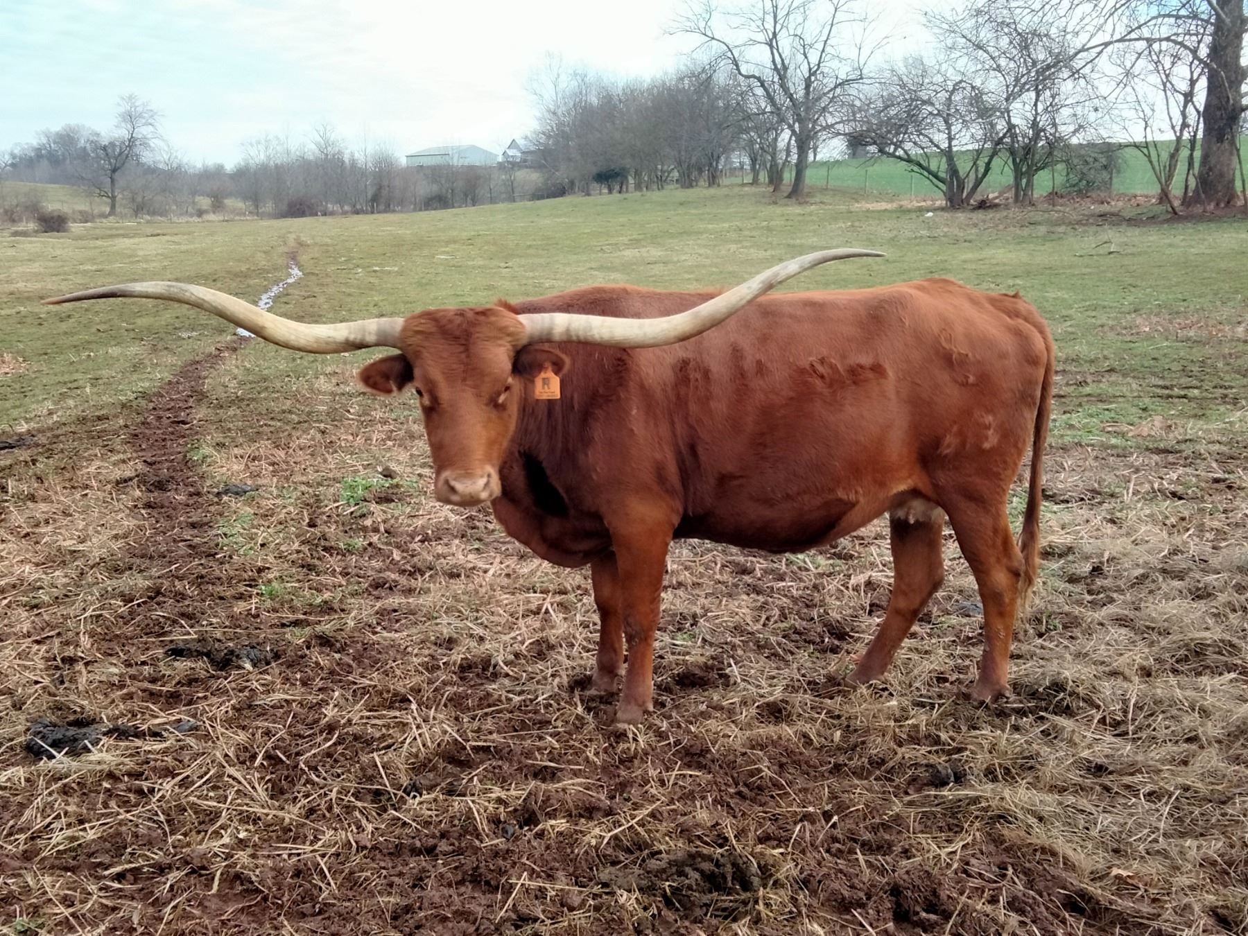 Here's a special offering. A beautiful cow knocking on 90 inches from some older genetics from the heart of Owen McGill's program and from one of Joe Munche's best cow families the Miss Terrific cow. She's not a huge cow but correct in every way, calm disposition and easy to work. More info at Sunhaven longhorns.