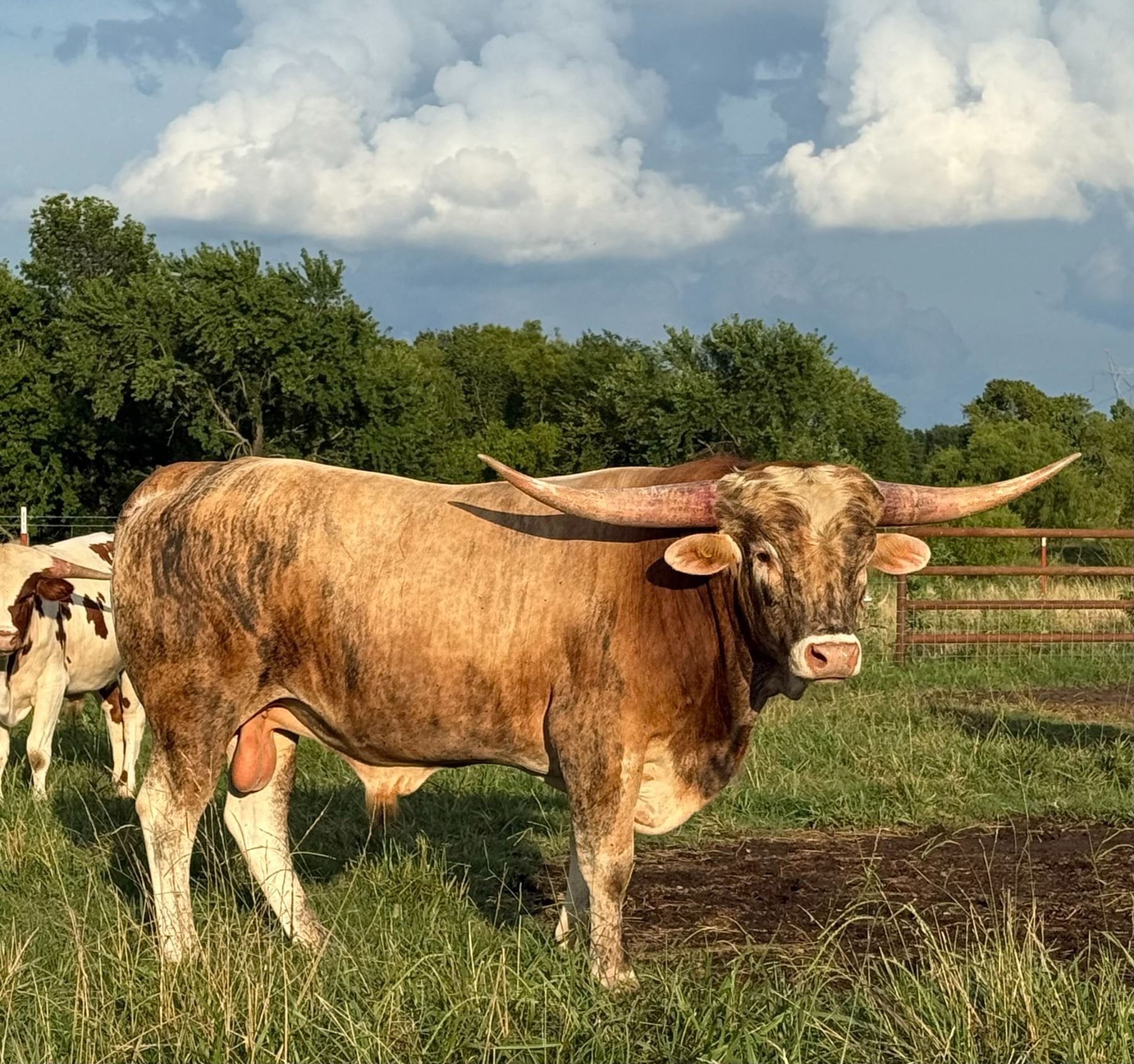 TRUE TEXAN 344 is sired by the 93" son of Cowboy Tuff Chex TRUED UP BCR, and is out of an 88.5 " cow PACIFIC LEILA. Pacific Leila is an own daughter of the 101.5" cow LEAH LEIGH. True Texan is a beautiful blonde brindle colored bull with great conformation ( bone & muscle), amazing disposition, and great horn direction. True Texan has been shown and placed decently at the 2025 Winchester Futurity, Battle On The Prairie Futurity & Chisholm Trail Futurity. The most recent horn measurement taken was on 05/24/2025 where he measured 55 1/8" TTT. With this bulls genetic power, he would improve anyone's program. This bull sells with 100% ownership, possession,& interest!