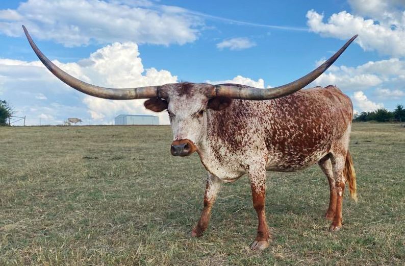 Comments: Red and white roan, colored up and a ton of horn! Medium framed