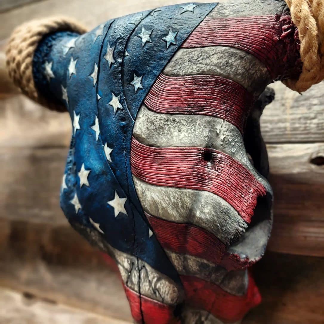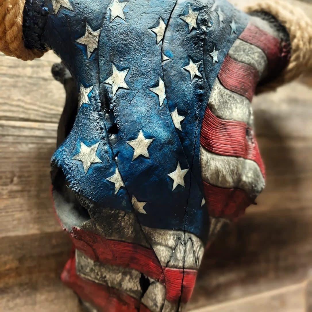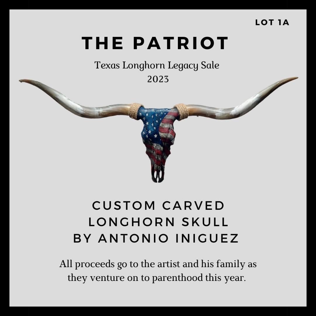 A one of a kind custom carved Longhorn skull titled, The Patriot, by Antonio Iniguez with Iniguez Skullworks. All proceeds go to the artist and his family as they venture on to parenthood this year.