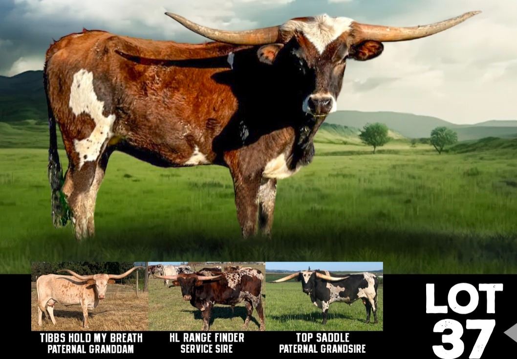 COMMENTS: OCV’d. Sweetheart of a two-year-old heifer with a beautiful head and a great set of twisty horns (50” T2T at 22.5 months!) that make it easy to fall in love with. She has flashy color with plenty of black (Saddlehorn) and black and white (Hiccup, Top Saddle) in her genetic background. There are no holes in Tip Jar’s pedigree with all four grandsires and granddams over 80” T2T. More info on www. feylonghorns.com