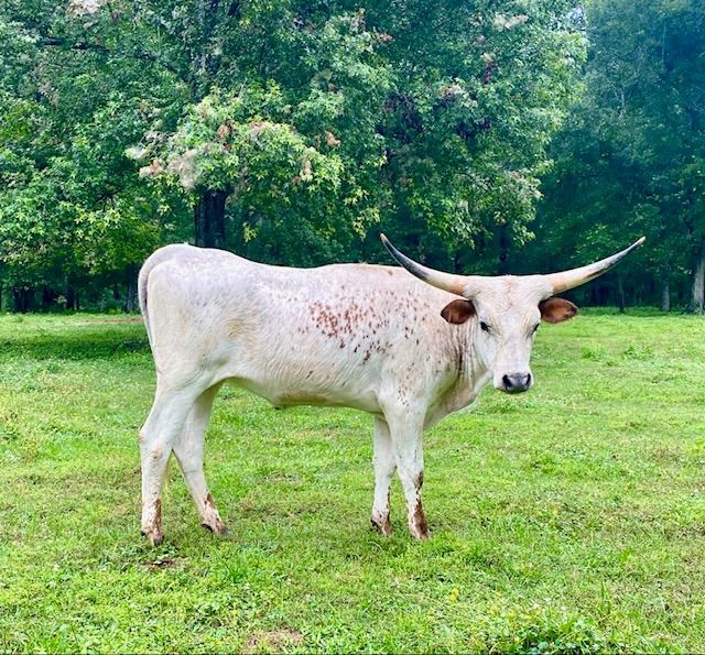 petite and very feminine, at 18 months, she measures 44.75” at the hip. She is blossoming into a real beauty, developing more flea bitten roan in her coat as she matures. Her attractive high horn set has all the indicators for roll over and twist. She has an extremely quiet disposition and is easy to work. Ethel is unexposed and we feel she could benefit either a miniature or standard herd. We are fortunate to own her full sister and the Iodine influence will live on.