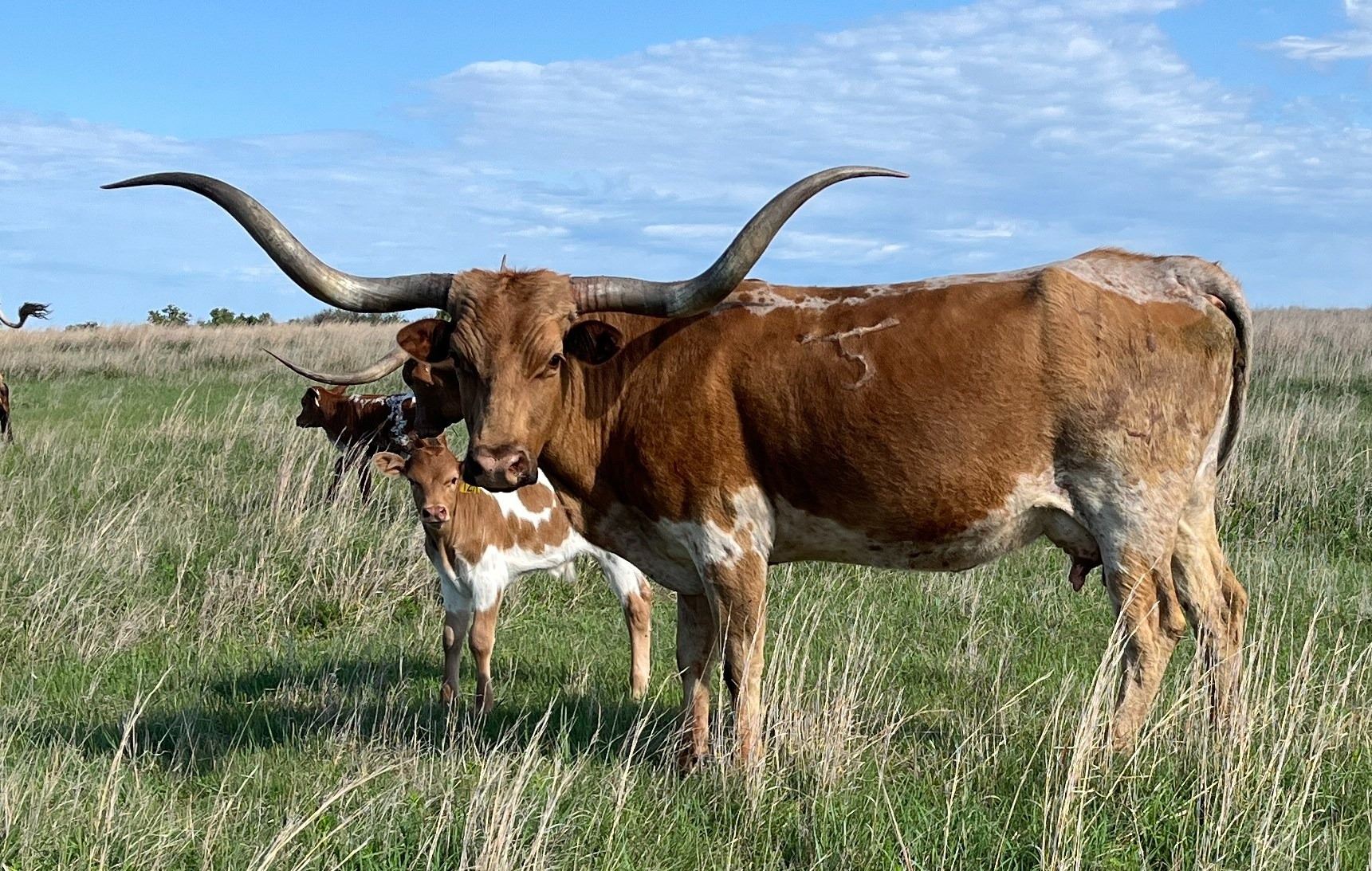 THIS IS ONE OF OUR SEEDSTOCK FEMALES, BEAUTIFUL UDDER, GENTLE, AND A TOTAL PACKAGE OF HORN, BODY, AND COLOR. HER SIRE GOES BACK TO WINCHESTER AND SUPERMAN, 6TH GENERATION OF OUR PROGRAM. SHE HAS MADE NO MISTAKES, 8 CALVES IN 10 YEARS, A GREAT MILKER BRED TO BH BLUEBOY, OUR BUE ROAN PATTON SON FOR HER 2025 CALF.